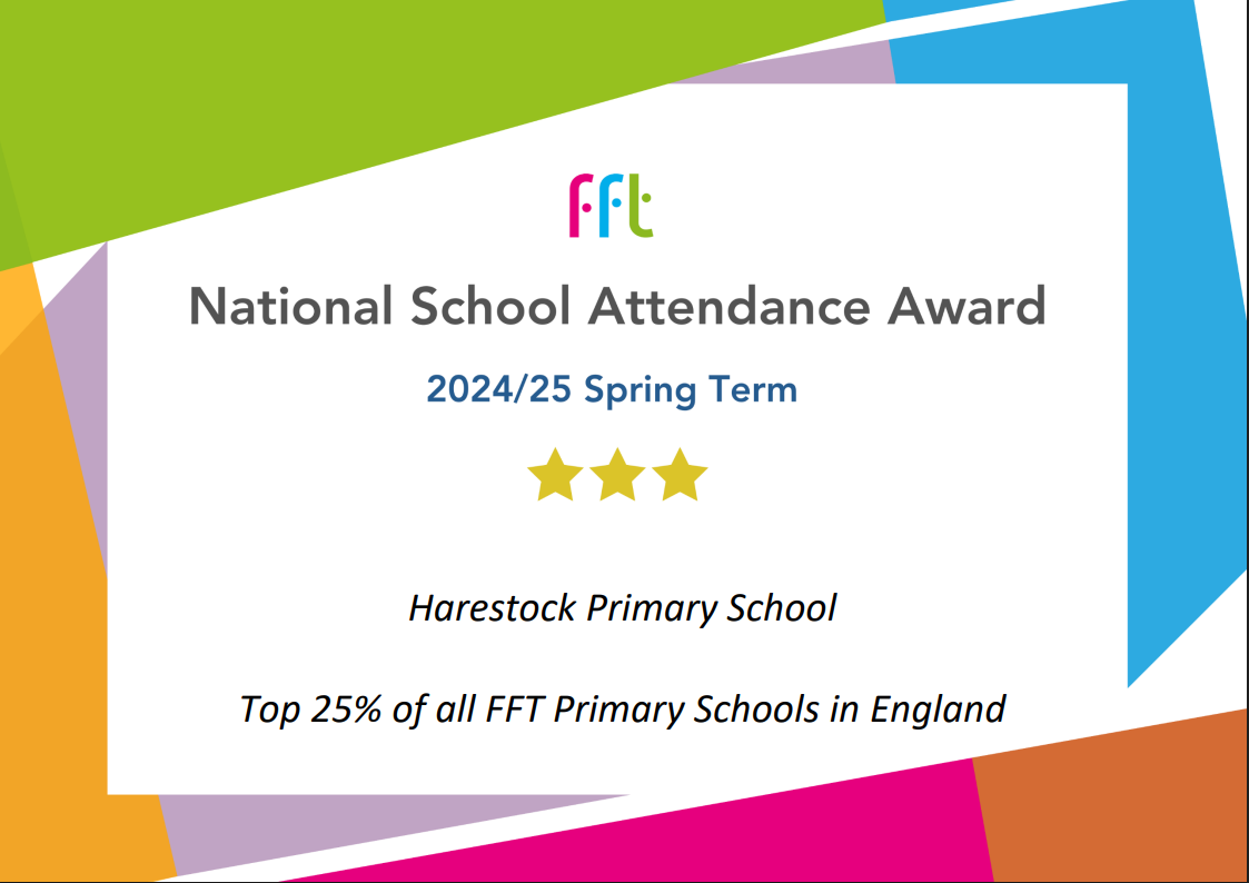 Harestock Primary SchoolWe are delighted that we have been awarded an Attendance Award for being in the top 25% of schools with the highest attendance during the Spring Term 2025!